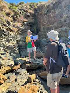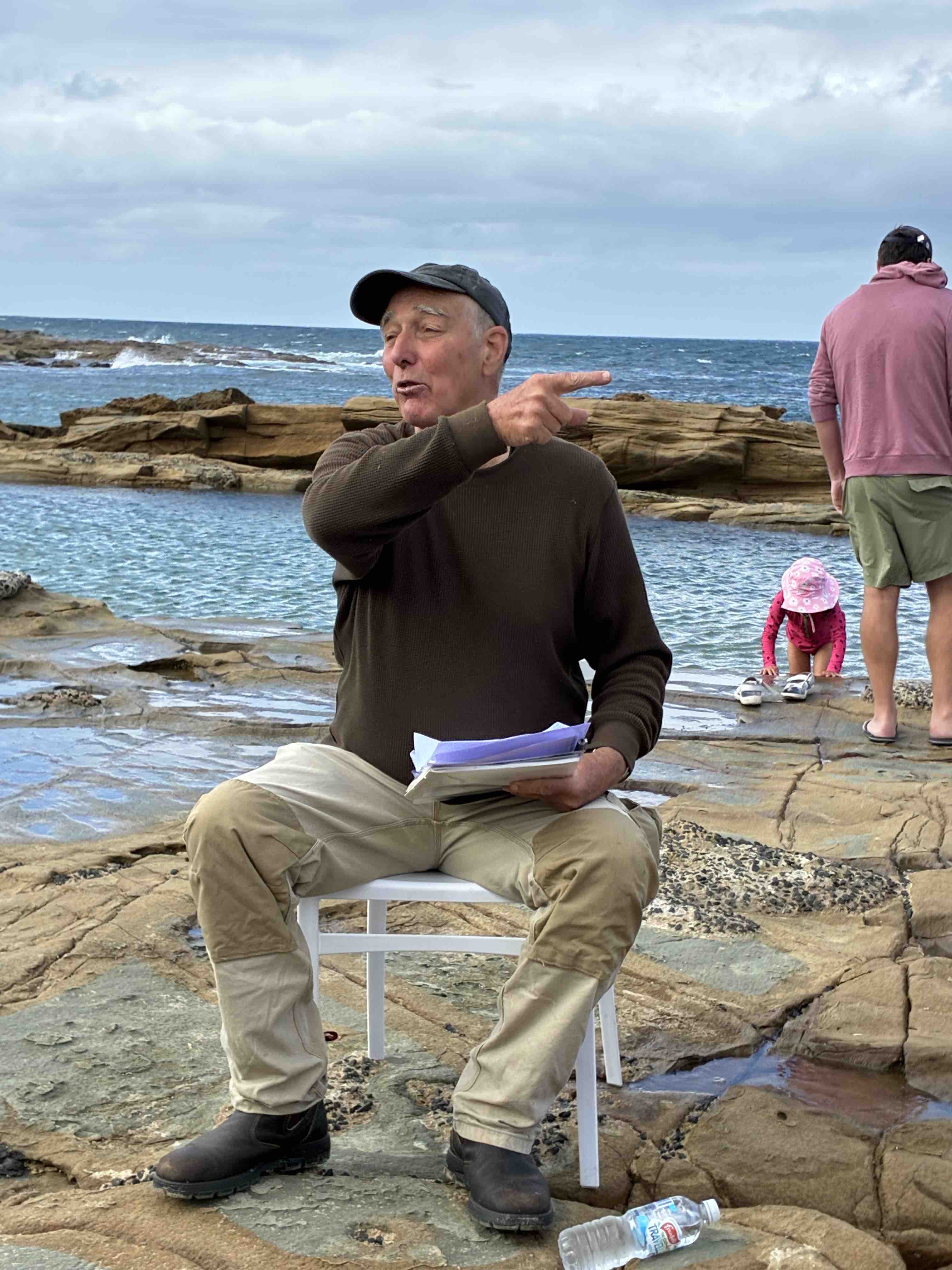 Our resident geologist Kevin Hill gave an outstanding tour of our beachfront from the Bay Beach to the edge of First Surf Beach. In perfect weather conditions, we learned of the geological forces that shape and have formed our beaches, rock shelves, reefs and cliffs. Who ever knew that the red rocks and seams on our rock shelves were formed from high pressure subterranean water seeping to the surface and that the black basalt differs so much from the ubiquitous grey sandstone on our foreshore. Many thanks to Kevin for educating up to 30 of us on an aspect of our coast that we hardly knew about.